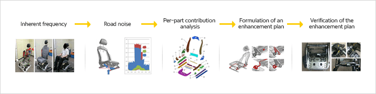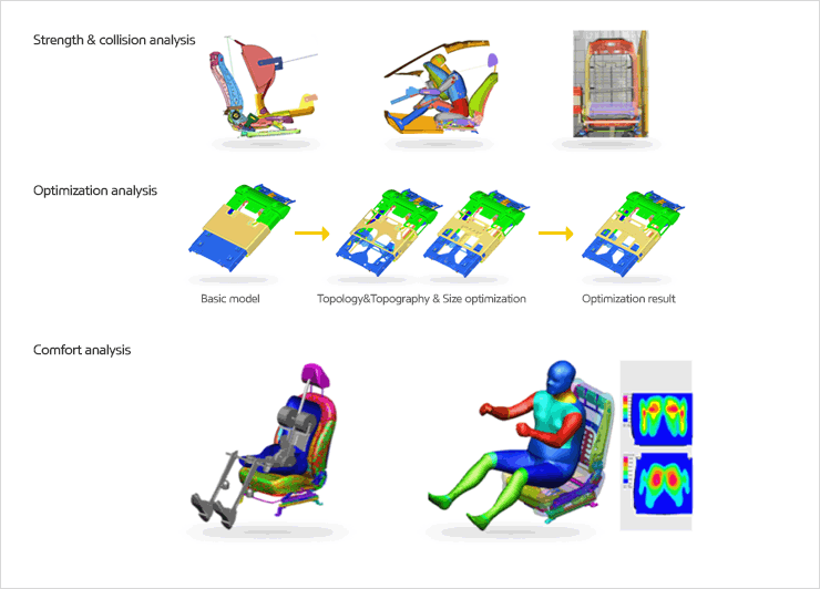 Utilizing computer analysis, HYUNDAI MSEAT forecasts and improves the performance of a seat product before developing the product. Accordingly, the Company can secure its quality at an early stage and reduce its development period and cost.