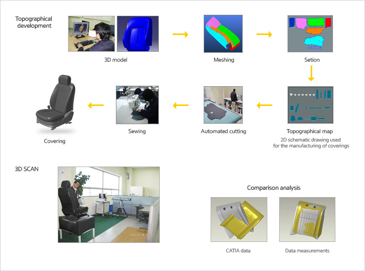 Using various design CATIA data, HYUNDAI MSEAT has manufactured covering products with topographical maps accommodating relevant seat design patterns & quality elements in order to produce stylish car seats. In addition, the Company has enhanced the precision of its products through the comparison analysis of certain 3D ‘SCAN & CATIA’ data.